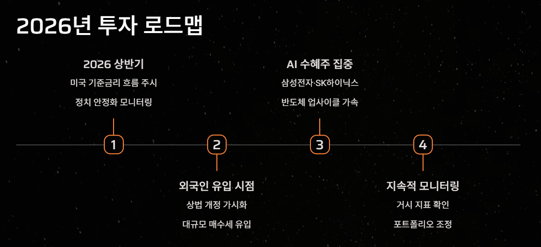 2026년 한국 시장은 정치적 안정, AI 수혜, 금리 인하라는 삼박자가 맞물리는 시기입니다.