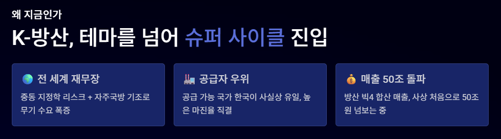 • 공급자 우위 시장: 전 세계적으로 무기 수요는 폭증하는데 공급 가능한 나라는 한국이 거의 유일합니다. 이는 높은 마진율(수익성)로 이어집니다.