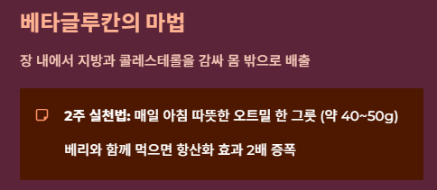 | 귀리(오트밀) | 베타글루칸 | 콜레스테롤을 가두어 배출하는 끈적한 젤 형성 |
