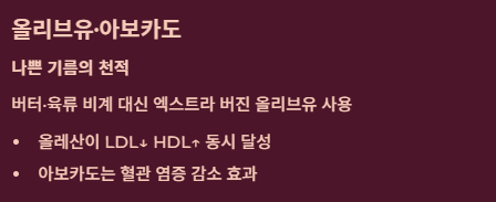 | 아보카도 | 단일불포화지방산 | 혈관 염증을 줄이고 LDL 산화 방지 |