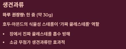 | 아몬드/호두 | 식물성 스테롤 | 장내 콜레스테롤 흡수 방해 및 혈관 탄력 개선 |