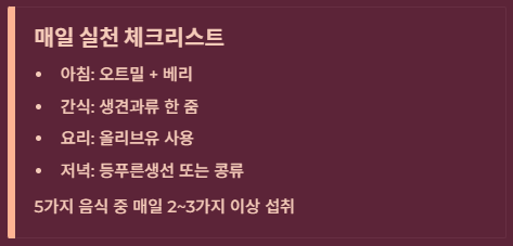 - 5대 음식: 귀리, 생견과류, 올리브유, 베리류, 생선(또는 콩류).